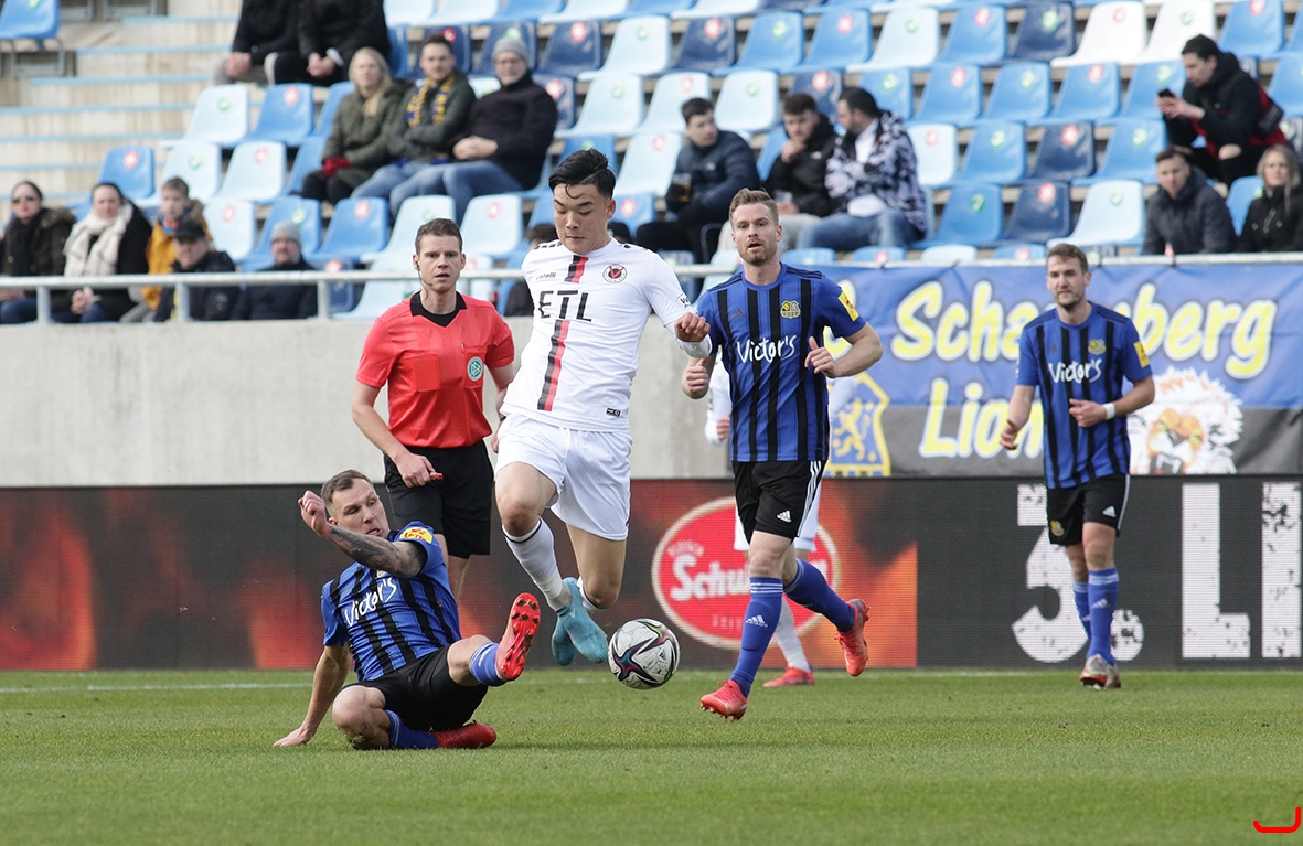1. FC Saarbrücken gegen Viktoria Köln - Tobias Jänicke (links) gegen Seokju Hong